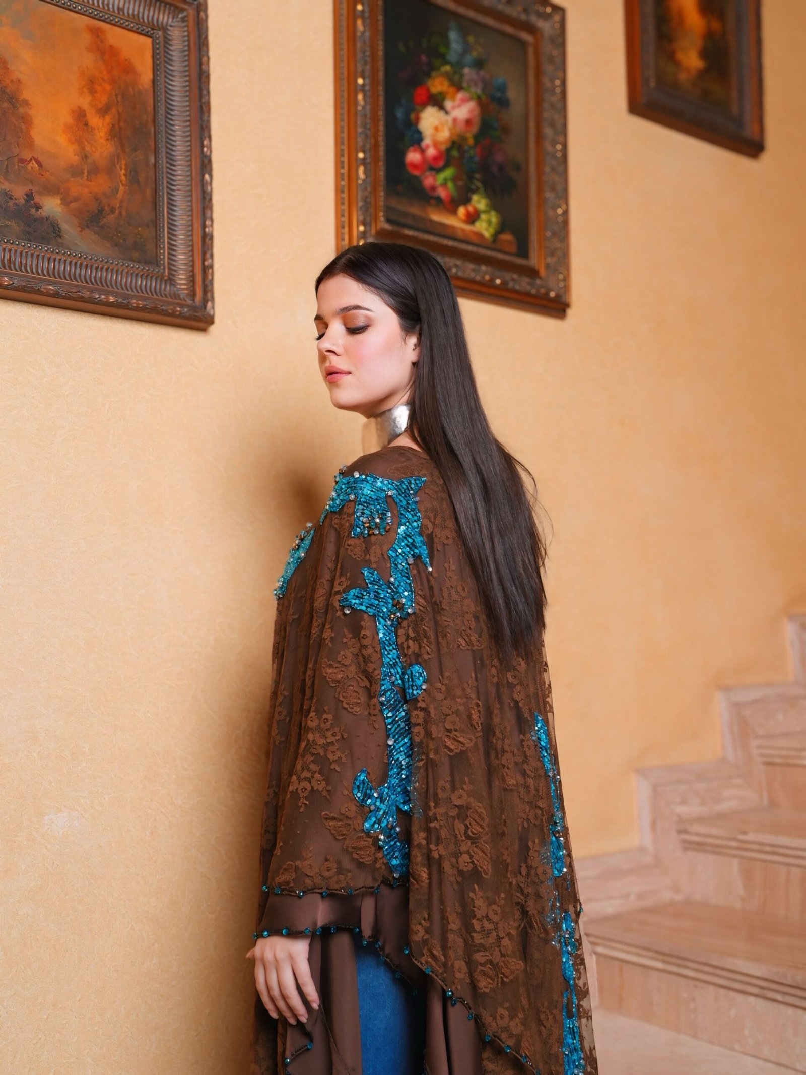 Handmade Double layed lace and chiffon poncho with truquoise stones and crystals