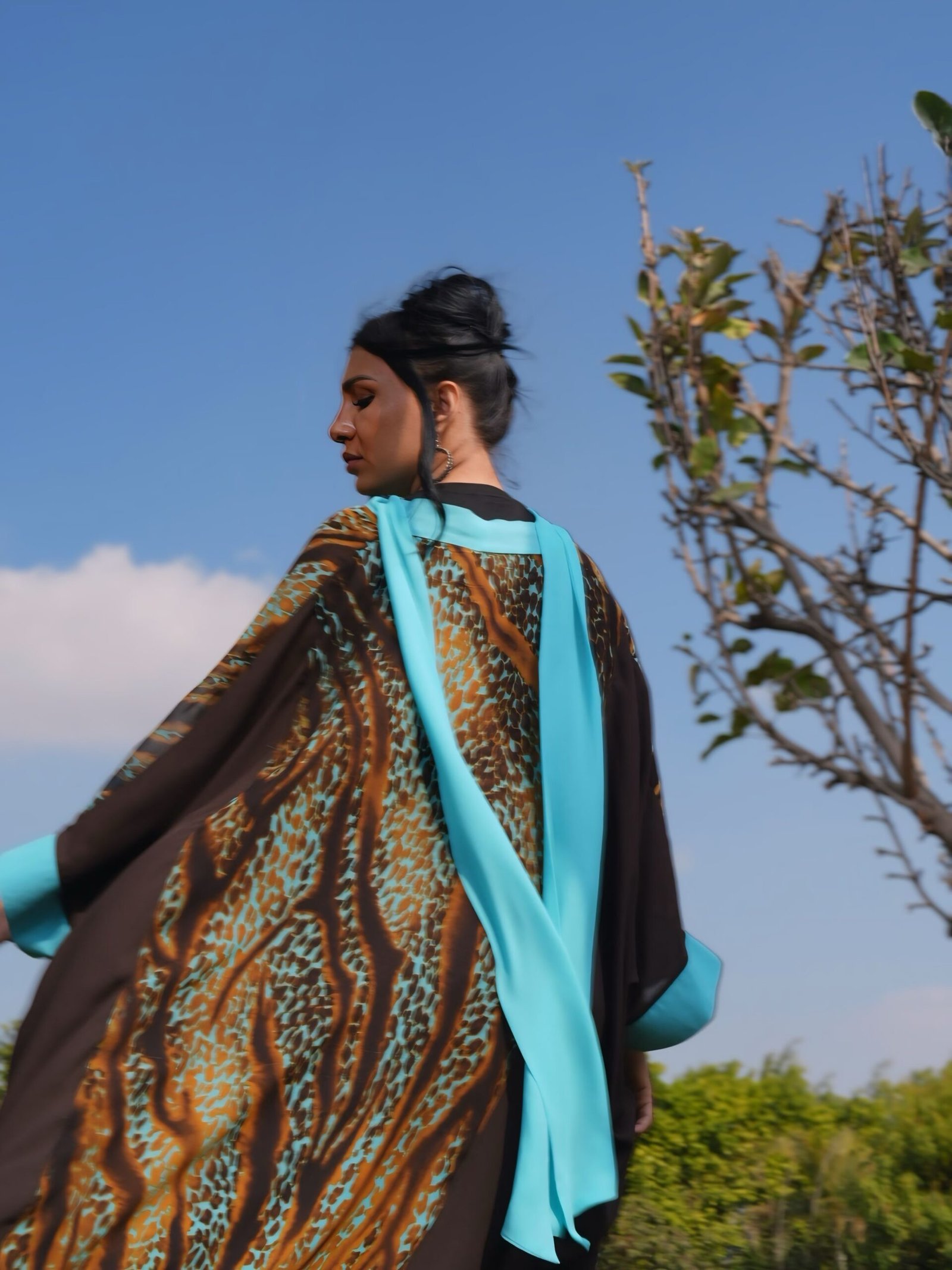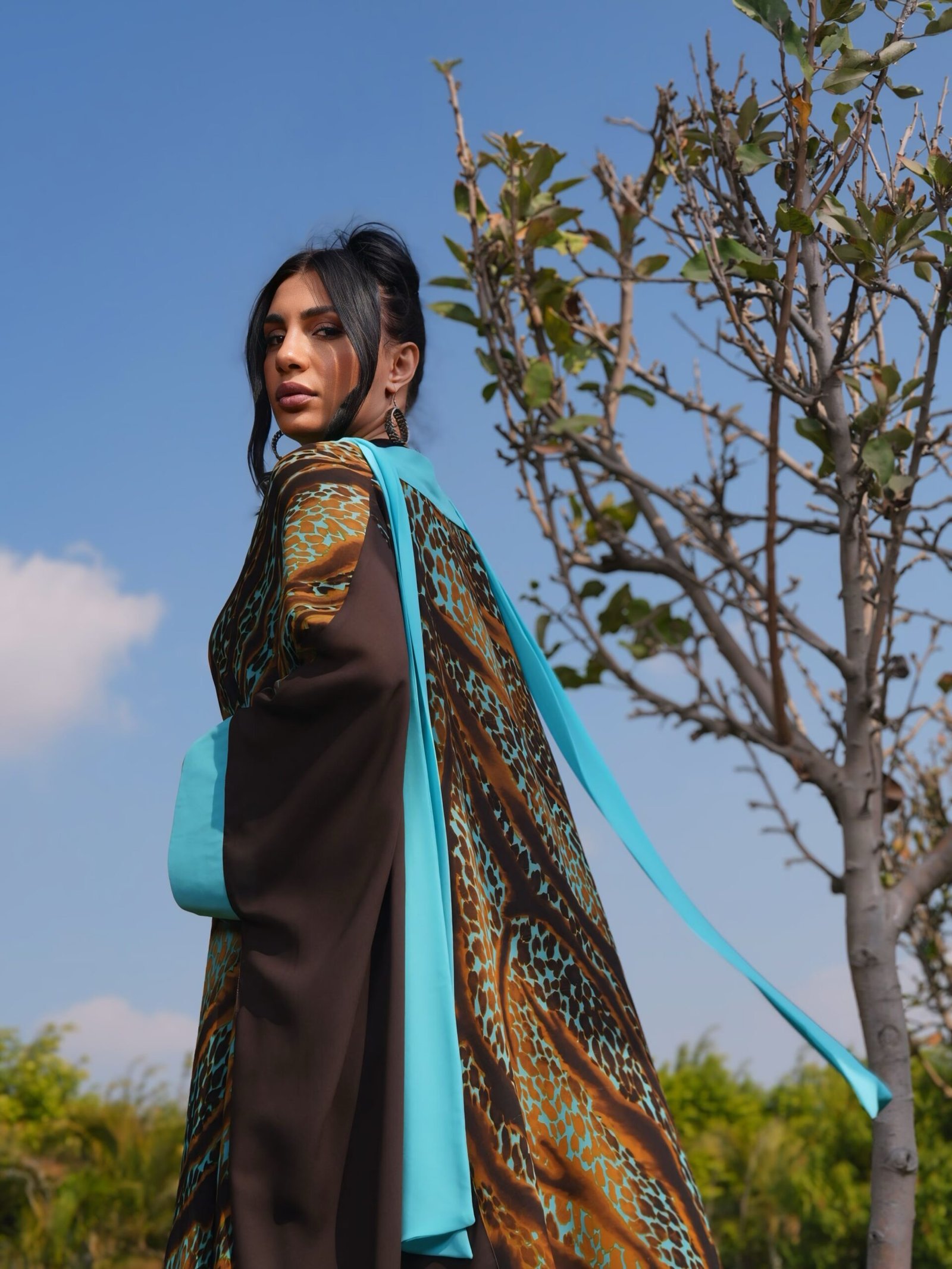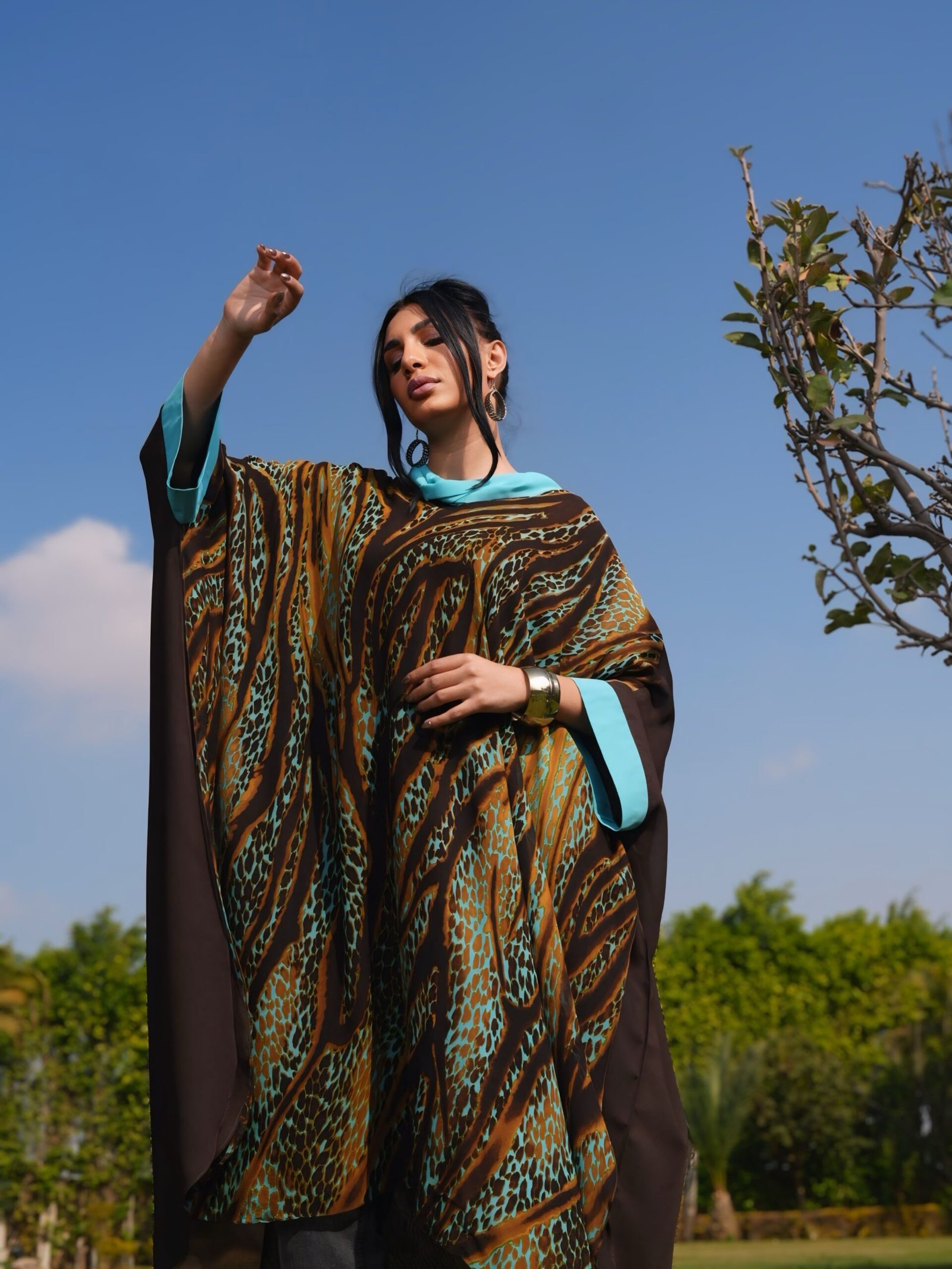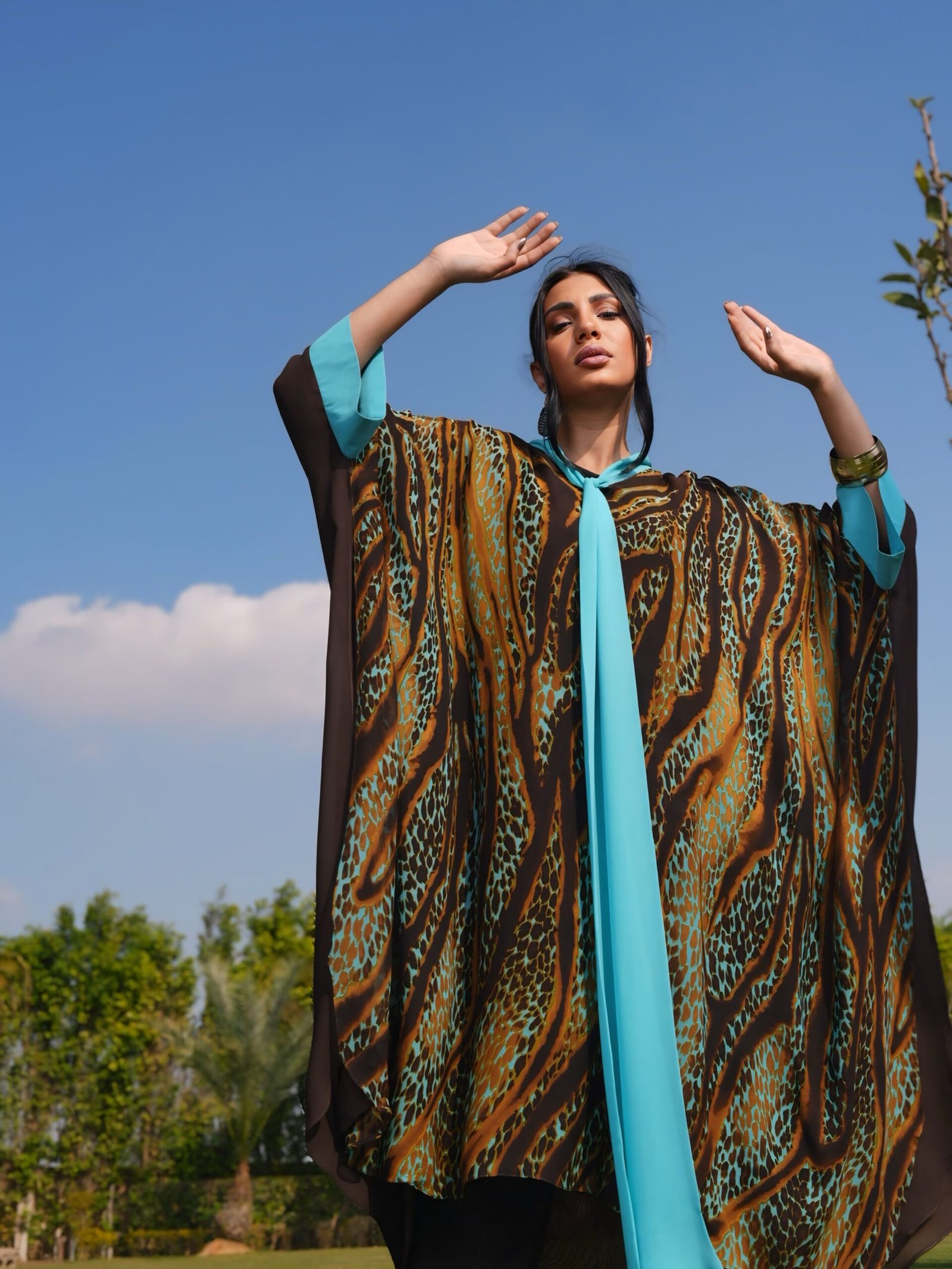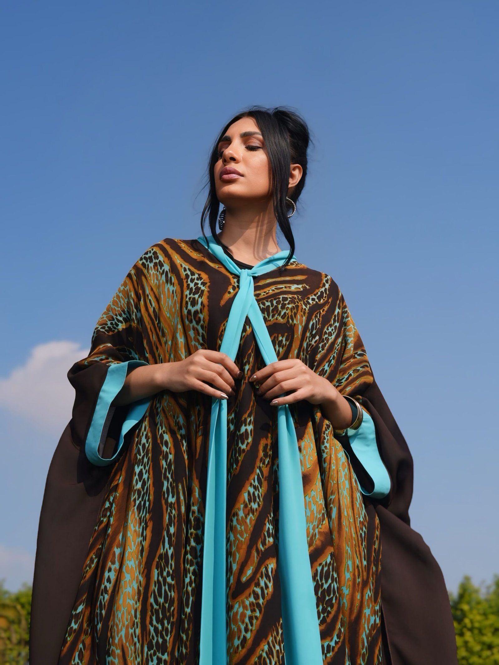 Leopard-print brown and turquoise poncho with bow-tie